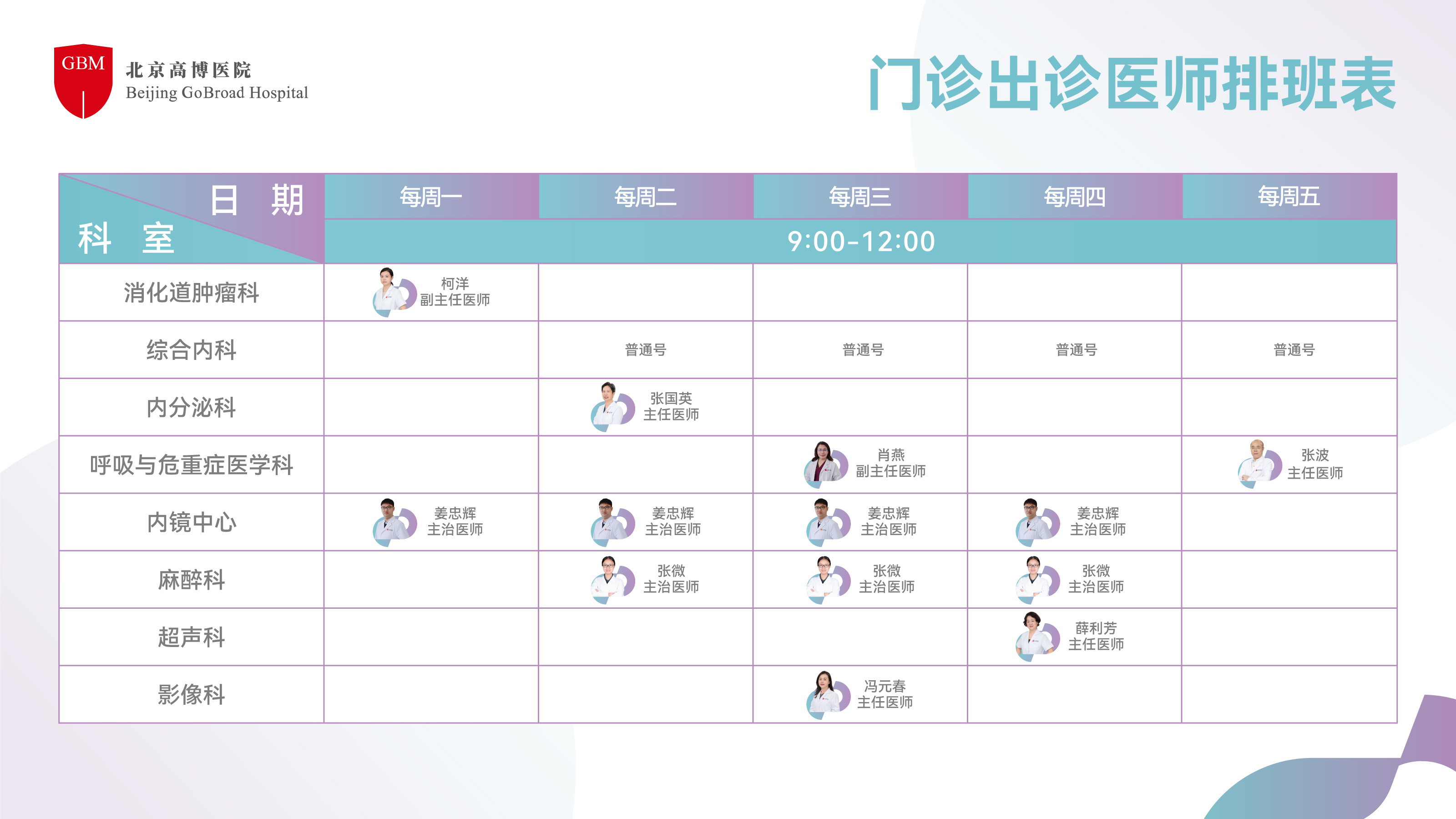 北京高博医院目前开设门诊的门诊科室有呼吸与危重症学科、消化道肿瘤科、综合内科、综合内科-儿童血液病、超声科、放射科、内分泌科,具体出诊信息见下图。