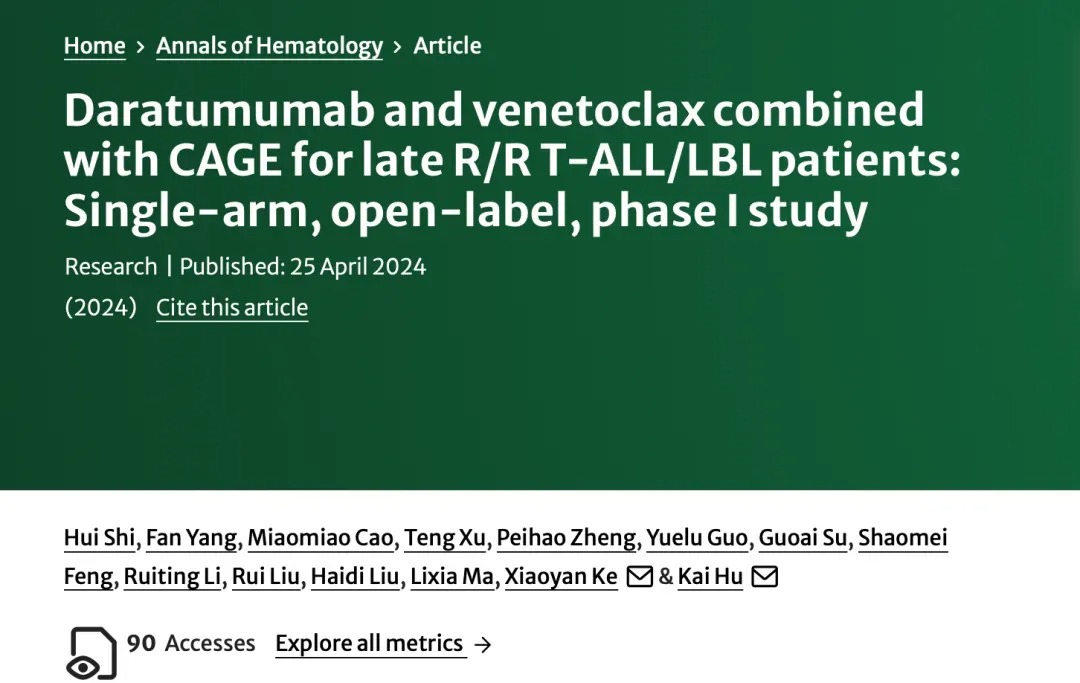 复发或难治性(R/R)T淋巴母细胞白血病/淋巴瘤(T-ALL/LBL)患者预后差,治疗选择有限。异基因造血干细胞移植(Allo-HSCT)是治疗复发或难治性血液肿瘤的有效方法,但许多患者因疾病未得到有效缓解而失去移植机会。针对这一状况,北京高博医院的克晓燕和胡凯教授团队开发了一种新的治疗方案Dara+Vene+CAGE,用于R/R T-ALL/LBL患者,作为异基因造血干细胞移植或CAR-T治疗前的桥接治疗。