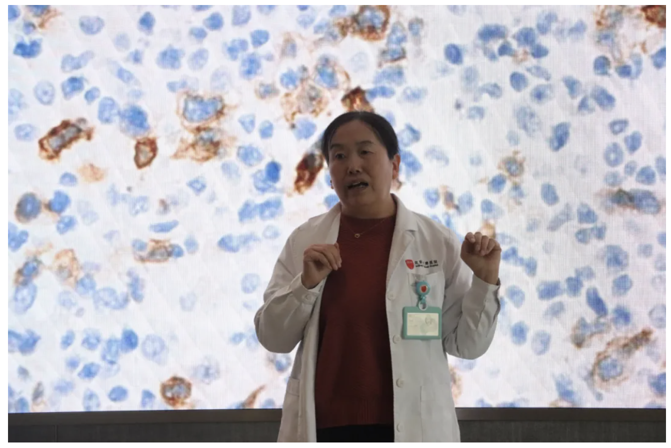 会议第二环节为“现场PTCL阅片与CD30人工和AI评价”实战环节,继续由北京高博医院病理科执行主任郭丽改主持。来自北京大学第一医院病理科副主任医师王微、解放军总医院第一医学中心副主任医师孙璐、北京大学第三医院病理科副主任刘翠苓、空军特色医学中心病理科主任李腾、中国医学科学院肿瘤医院病理科副主任医师农琳、北京同仁医院病理科副主任医师赵晓丽等专家组成阅片小组,现场对多例PTCL病例进行人工判读,并与AI平台分析结果进行比对。