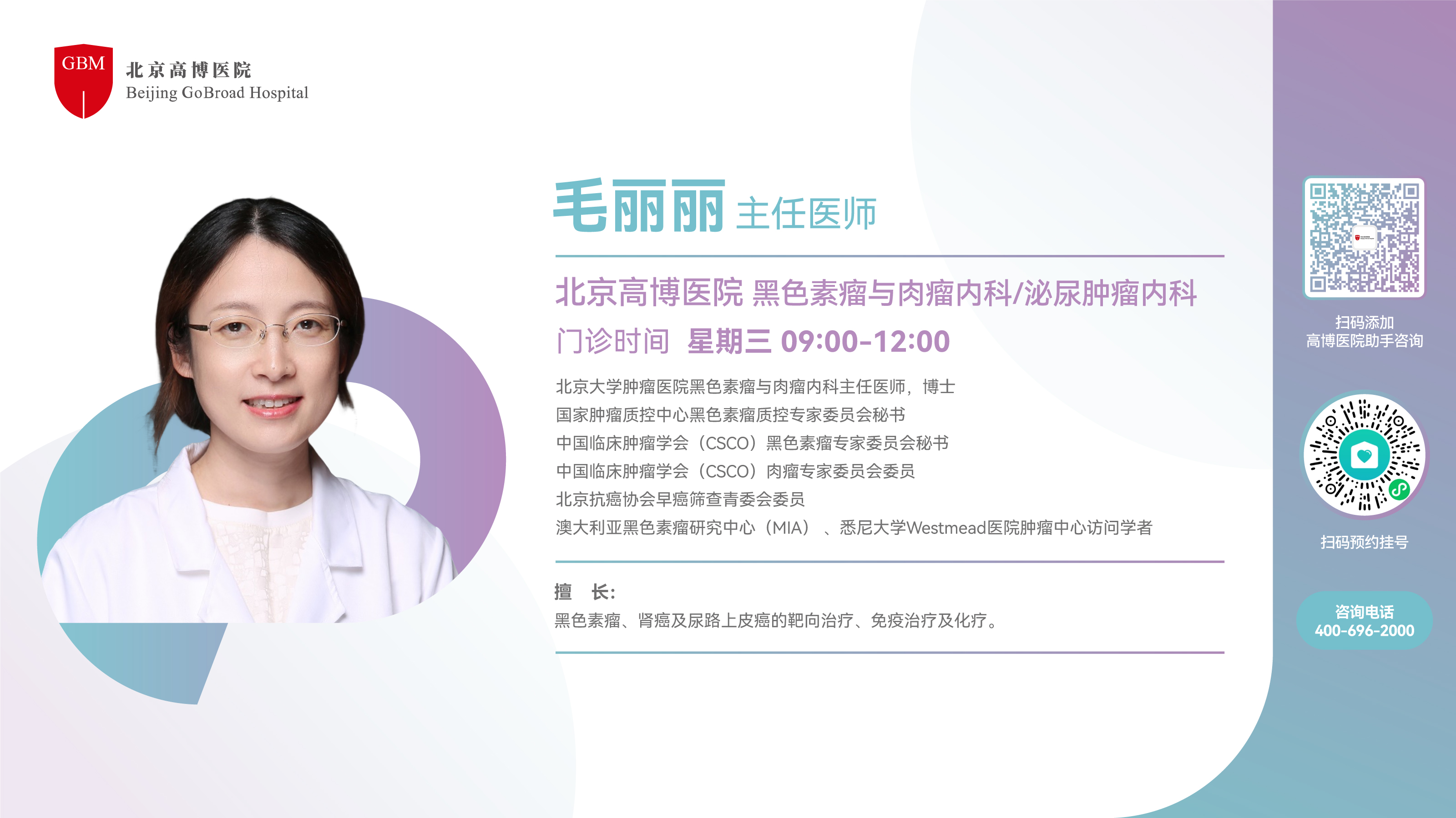 毛丽丽教授在北京高博医院黑色素瘤与肉瘤内科&泌尿肿瘤内科的常态化出诊安排:每周三9:00-12:00,点击下方图片或扫描图中挂号二维码,即可预约挂号。