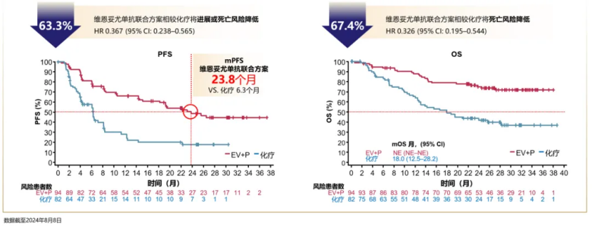 值得强调的是,2025年8月公布的EV-302研究亚洲亚组数据尤为亮眼。维恩妥尤单抗联合方案可将mPFS从6.4个月延长到23.8个月,为化疗的近4倍,疾病进展或死亡风险显著降低63.3%;mOS尚未达到,死亡风险显著降低67.4%;ORR高达72.2%,其中CR高达41.1%,为化疗的两倍以上[4]。这些获益不仅与全球总体人群保持一致,更在数据上呈现更优的趋势。