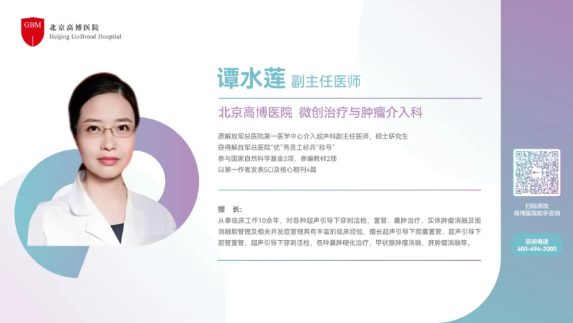 北京高博医院微创治疗与肿瘤介入科,由我国肿瘤介入领域领军人物邹英华教授领衔,谭水莲副主任医师,原解放军总医院第一医学中心介入超声科副主任医师,从事临床工作10余年。刘轩医师,先后于中国人民解放军总医院、新疆生产建设兵团医院等从事肿瘤介入工作10余年。团队凭借精湛的介入消融技术、丰富的临床经验和前沿的医疗理念,让介入更好地服务于结节诊断、肿瘤治疗、血管疾病干预等多个临床场景。