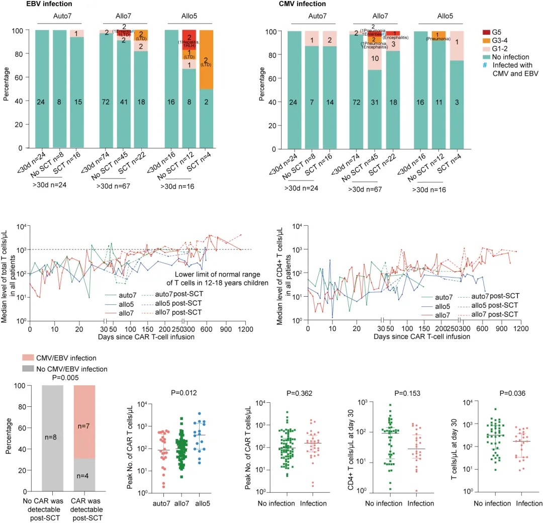 For patients undergoing bridge transplantation, following the conventional CD19 CAR-T treatment protocol, we expect the standard transplant and pre-treatment process to eliminate CAR-T cells. However, this is not always the case. Not all CAR-T cells disappear. For instance, in yesterday's Poster session, a team from the Western Theater General Hospital in China, led by Professor Su Yi, presented data showing that a small portion of patients still had CAR-T cells after transplantation. We’ve observed this phenomenon in our center and other transplant centers in Chengdu, Shanghai, and Wuhan. These patients later developed severe immune deficiencies. Therefore, we recommend that for patients after transplantation, especially those at less experienced transplant centers, it is crucial to monitor the patient’s T-cell phenotype post-transplant. This is because, after one month post-transplant, only 48% of patients' T-cells have recovered to a normal state with both CD7 and CD5 positivity, indicating that T-cell recovery is a slow process. If T-cells do not return to normal, the patient’s risk of infection will significantly increase.